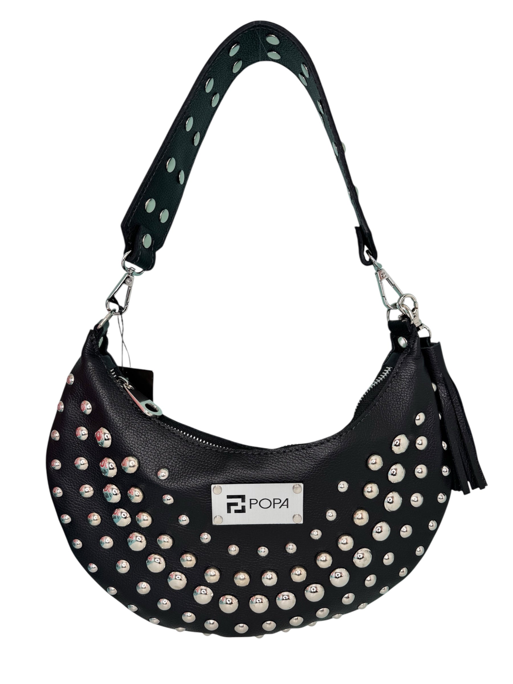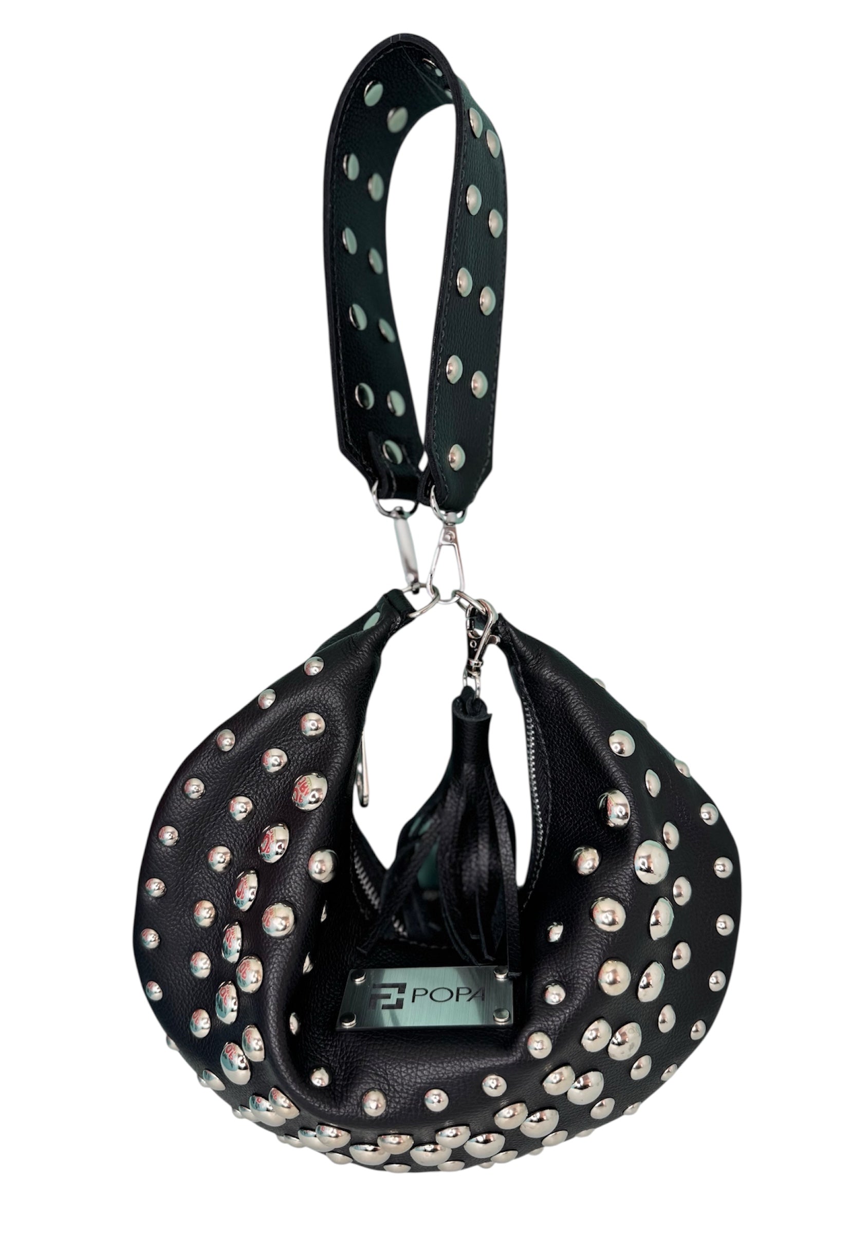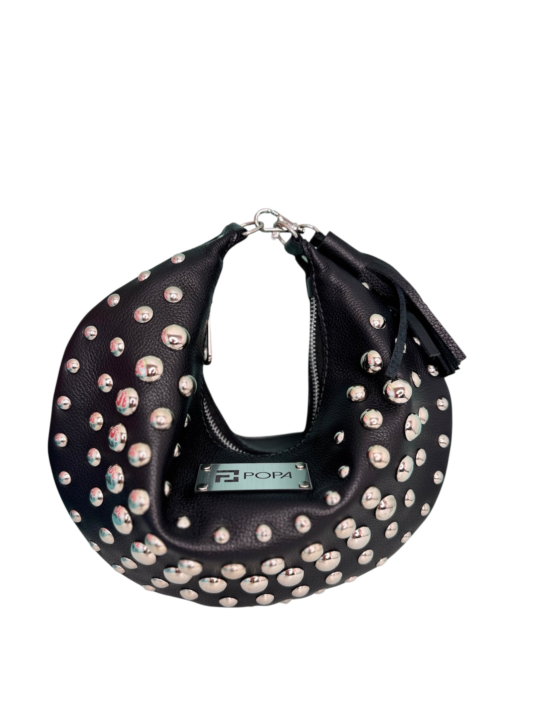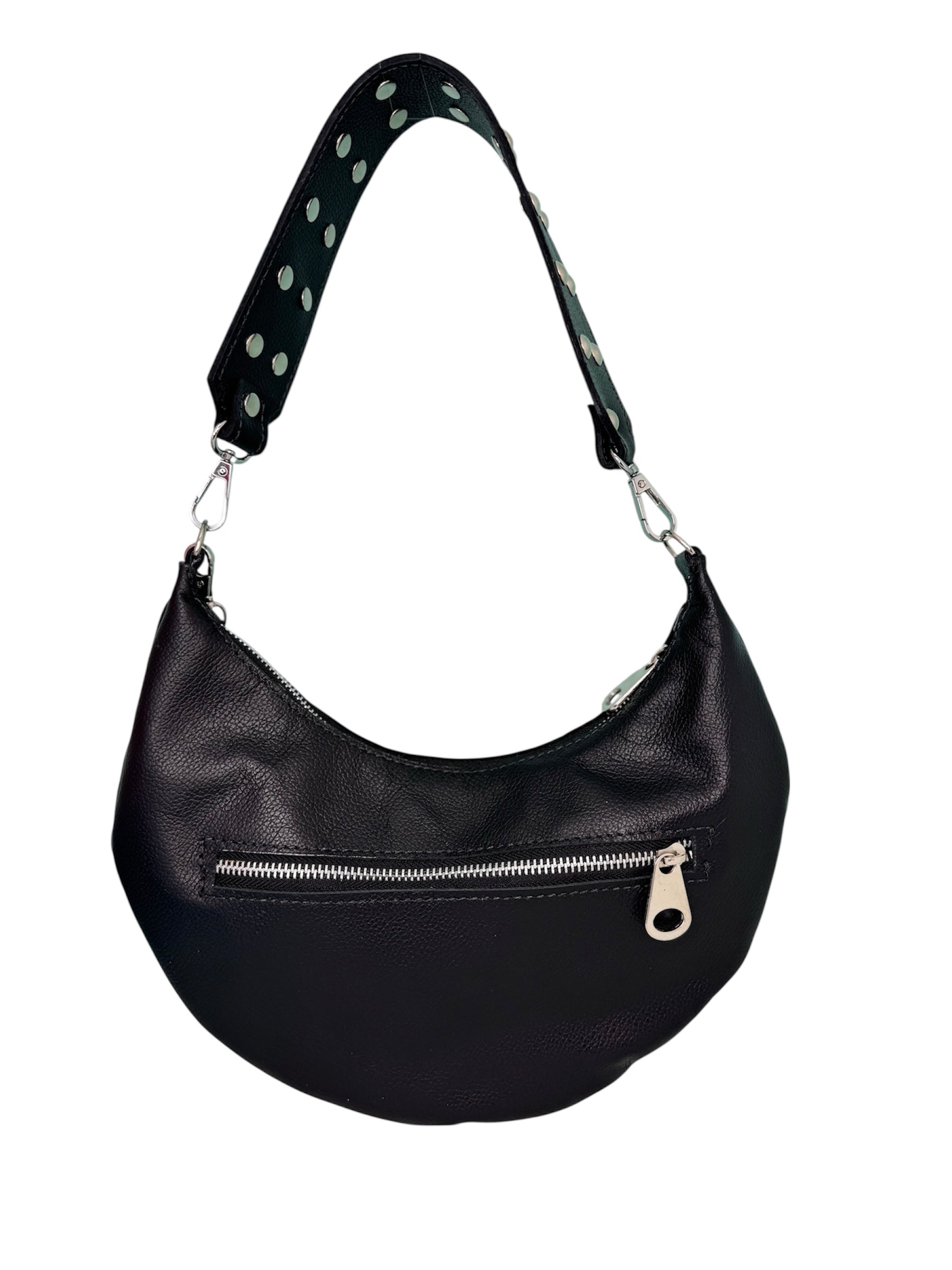 Su diseño plano y circular le otorga una amplia capacidad, ideal para acompañarte en cualquier ocasión. Puedes personalizarla con o sin tachas, según tu estilo. Su versatilidad permite usarla de hombro, de mano o cruzada, añadiendo una cadena o straps para adaptarla a tus necesidades.